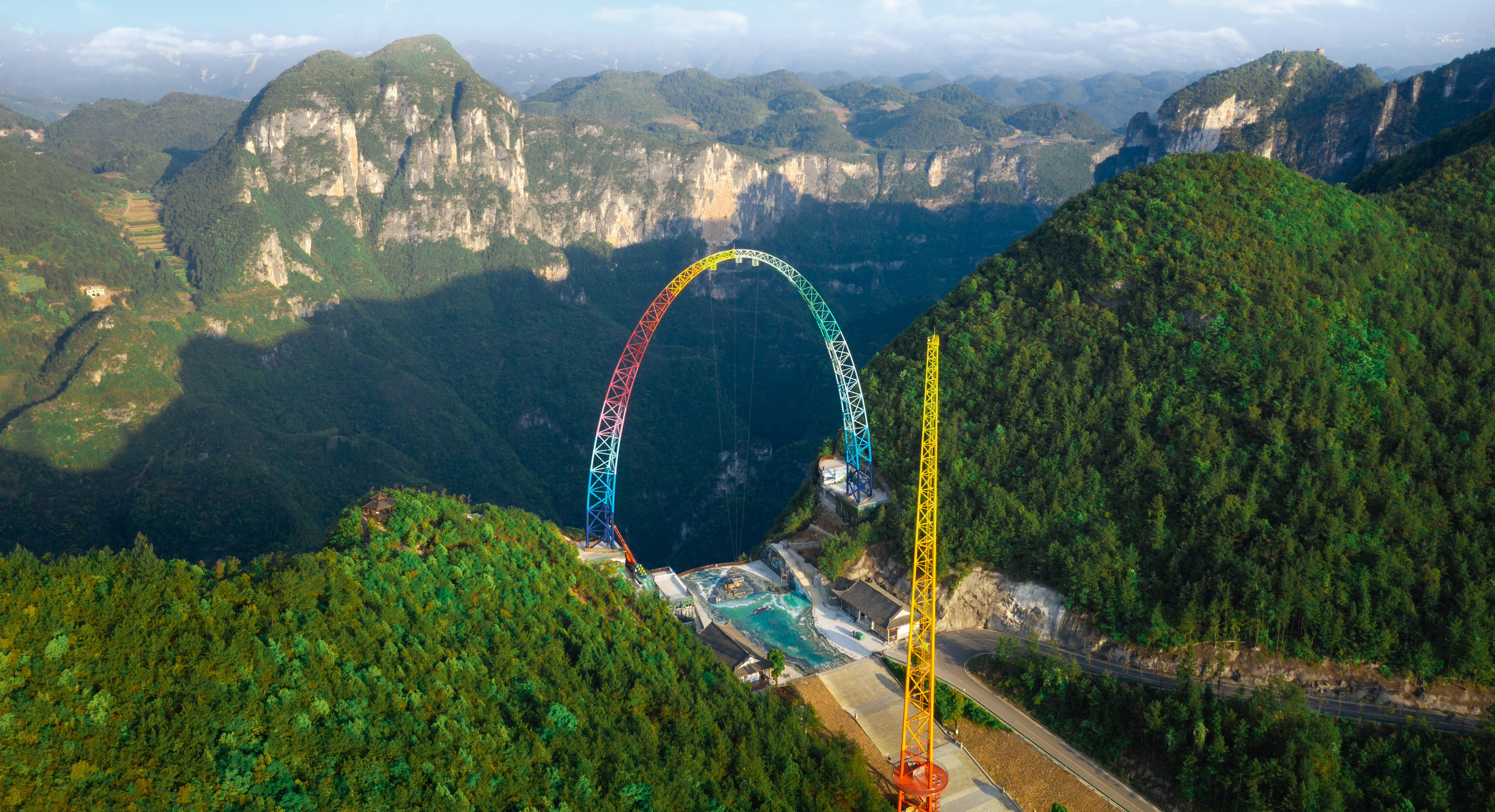 由中冶設(shè)備院自主研發(fā)、設(shè)計(jì)、制造、安裝的云端彩虹秋千,坐落于重慶龍缸5A景區(qū)700米的懸崖邊緣,主體由高100米、基礎(chǔ)跨距87.6米的彩虹涂裝拱形塔和高108米的提升發(fā)射塔等部分組成,該設(shè)備最大提升高度88m,最大運(yùn)行速度可達(dá)130km/h,以“世界最高的框架秋千”稱號(hào)被載入吉尼斯世界紀(jì)錄。